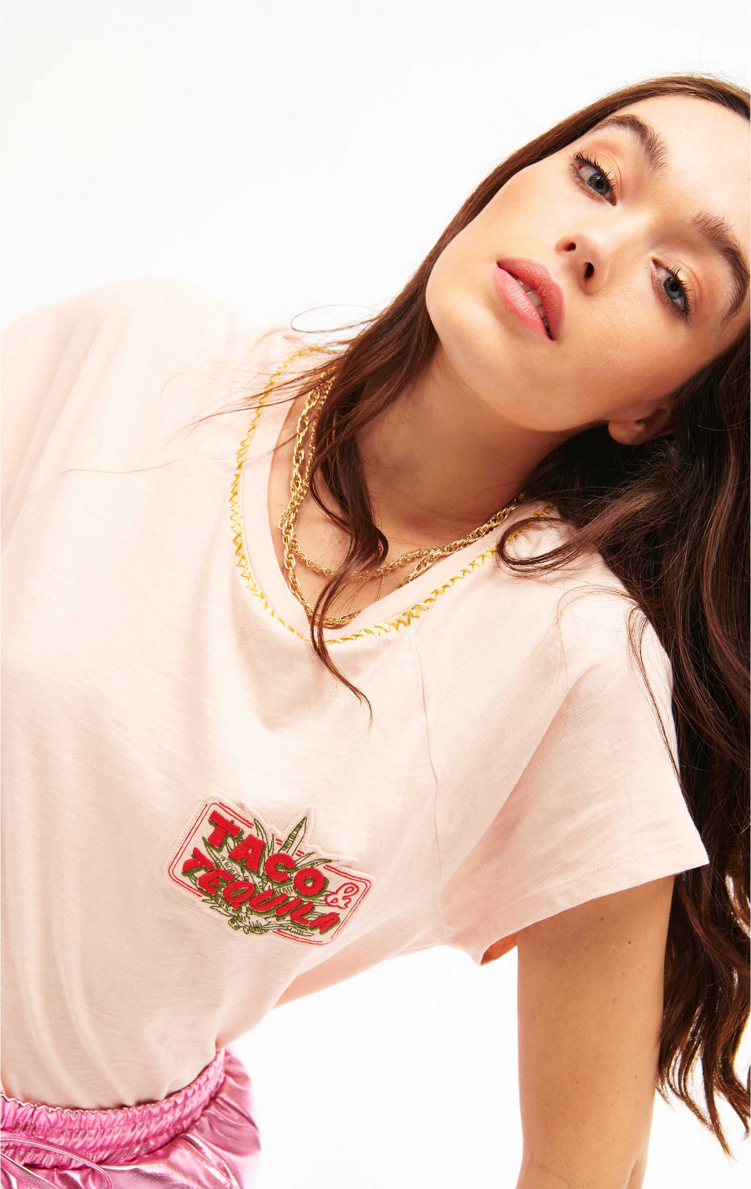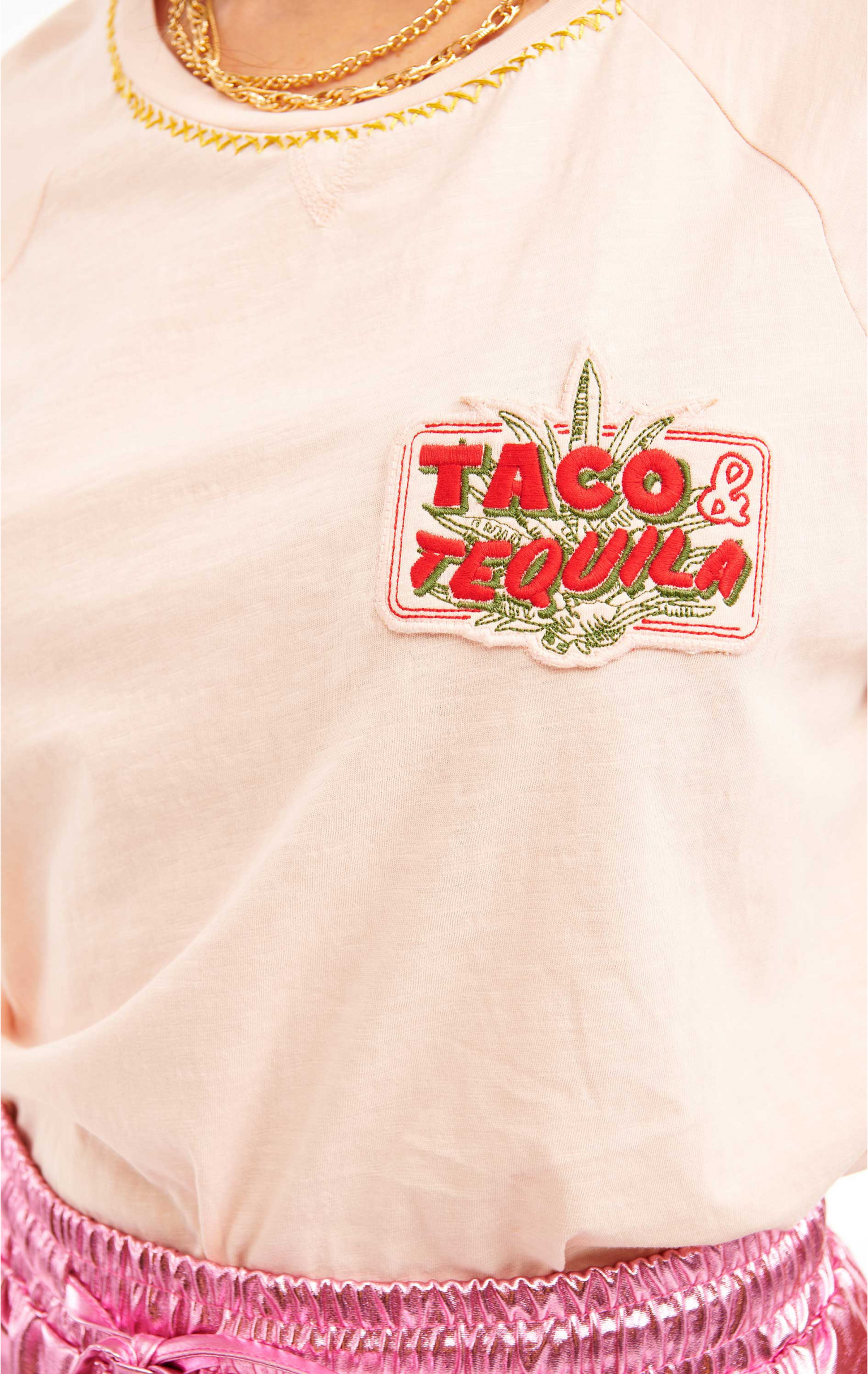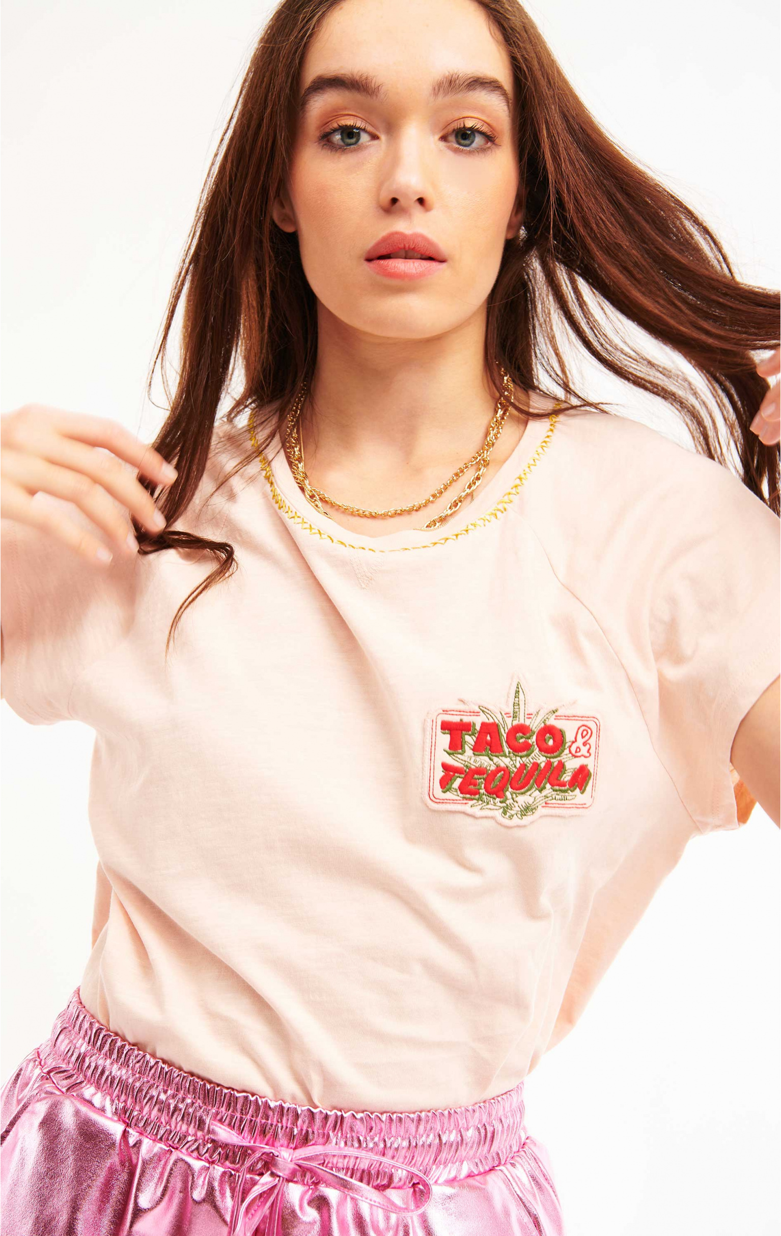 T-shirt oversize rose manches raglan, autour du col une broderie en points de croix en fil lurex doré. Sur le cœur à gauche est brodé un écusson fluo rose et vert «Taco Tequila».