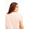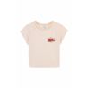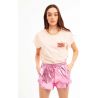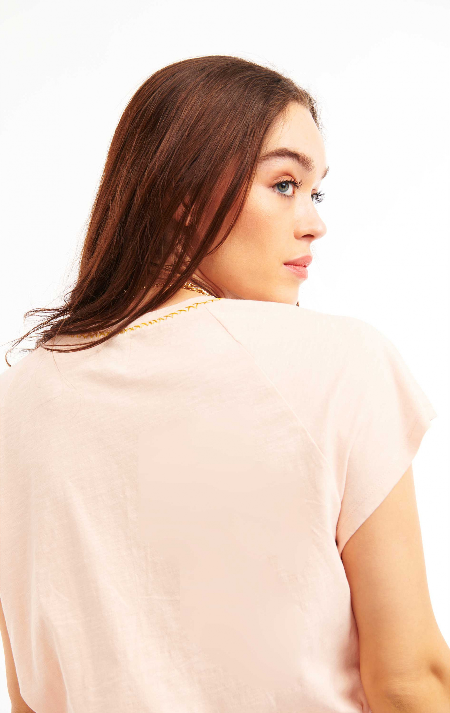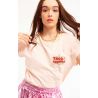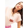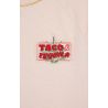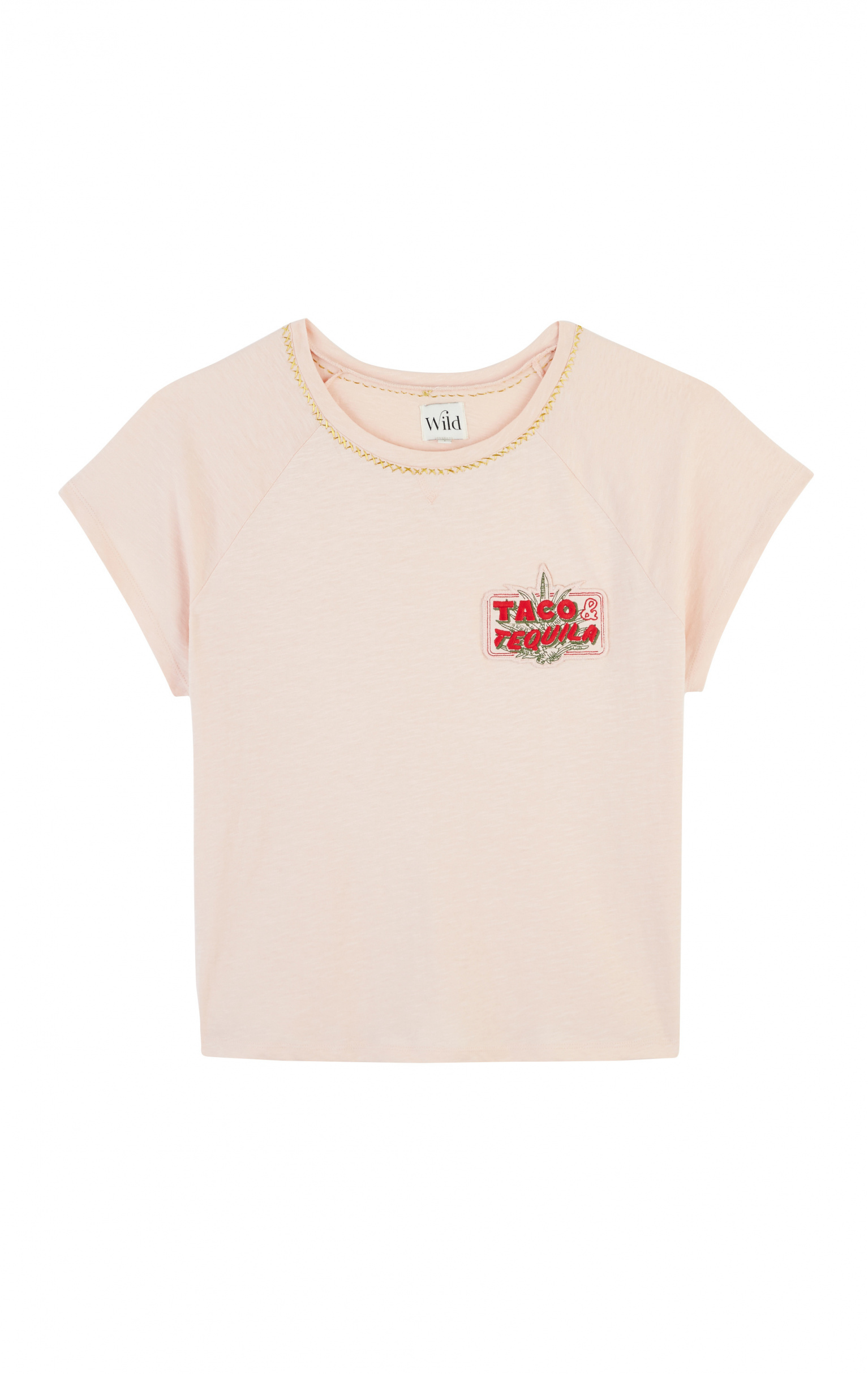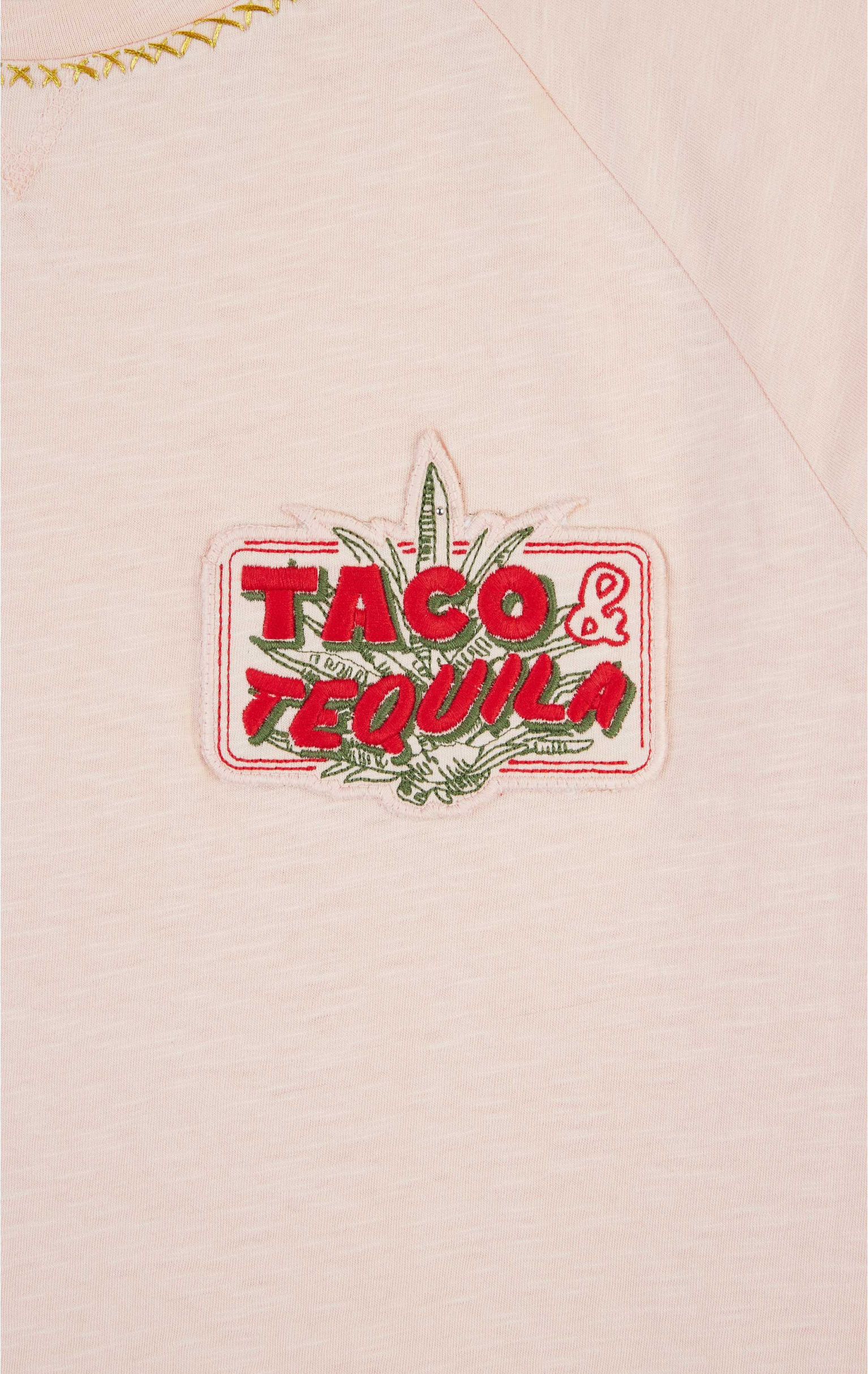 T-shirt oversize rose manches raglan, autour du col une broderie en points de croix en fil lurex doré. Sur le cœur à gauche est brodé un écusson fluo rose et vert «Taco Tequila».